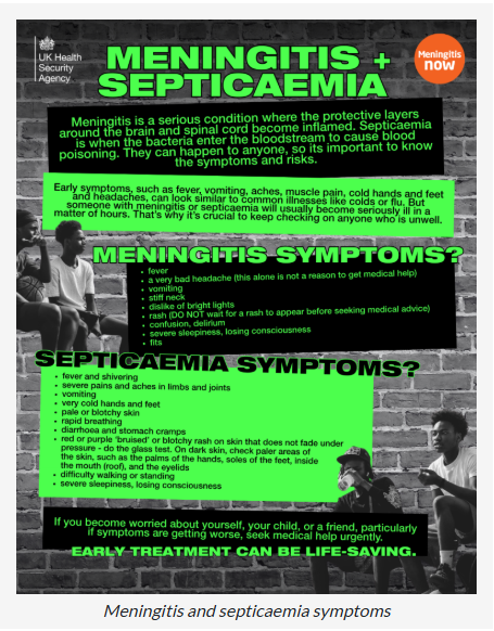 It’s important to be aware of how to recognise sepsis (septicaemia or blood poisoning) as well as meningitis. The most important signs to look out for are: